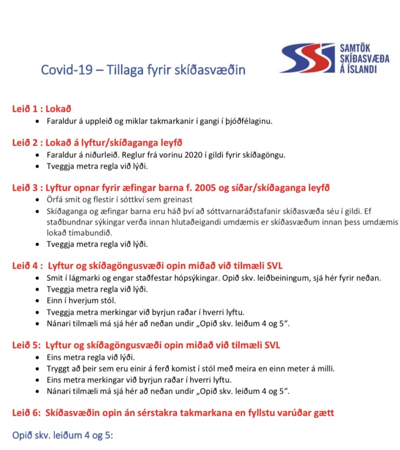 Upplýsingar um reglugerð skíðasvæða vegna COVID-19 má finna hér fyrir neðan. Við vinnum nú eftir leið 3 og eru göngubrautir og skiða æfingar fyrir 2005 og yngri leyfðar.